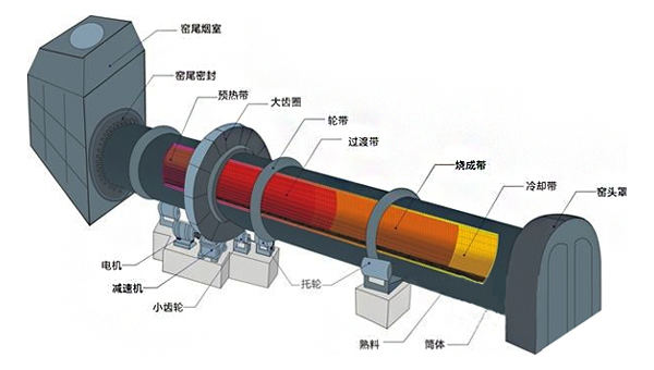 回轉(zhuǎn)窯(旋窯)是一個(gè)有一定斜度的圓筒狀物,斜度為3~3.5%,借助窯的轉(zhuǎn)動(dòng)來(lái)促進(jìn)料在回轉(zhuǎn)窯(旋窯)內(nèi)攪拌,使料互相混合、接觸進(jìn)行反應(yīng)。窯頭噴煤燃燒產(chǎn)生大量的熱,熱量以火焰的輻射、熱氣的對(duì)流、窯磚(窯皮)傳導(dǎo)等方式傳給物料。物料依靠窯筒體的斜度及窯的轉(zhuǎn)動(dòng)在窯內(nèi)向前運(yùn)動(dòng)。